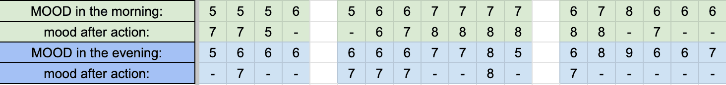 Po podjęciu takiej akcji – zapisywałem w tabeli, czy skala mojego nastroju uległa zmianie. Zaczynając te statystyki pierwszy tydzień, kiedy byłem w kiepskim humorze, zapisywałem prawie codziennie wynik między 5 a 6, ale po podjęciu “działań naprawczych” humor poprawiał się minimum o 1 notę. Śledząc te dane, po 5 dniach rozpoczynałem dzień nie jako 5, ale już 6, a niedługo potem i 7. Idąc spać zasypiałem również jako 7, a z czasem i 8. Wyobrażasz sobie jak miło spojrzeć na statystyki Ciebie, nie jakiejś korporacyjnej sprzedaży? Kiedy widzisz, że Patryk, stary – obserwujesz siebie, słuchasz tego co czujesz w środku, DZIAŁASZ.