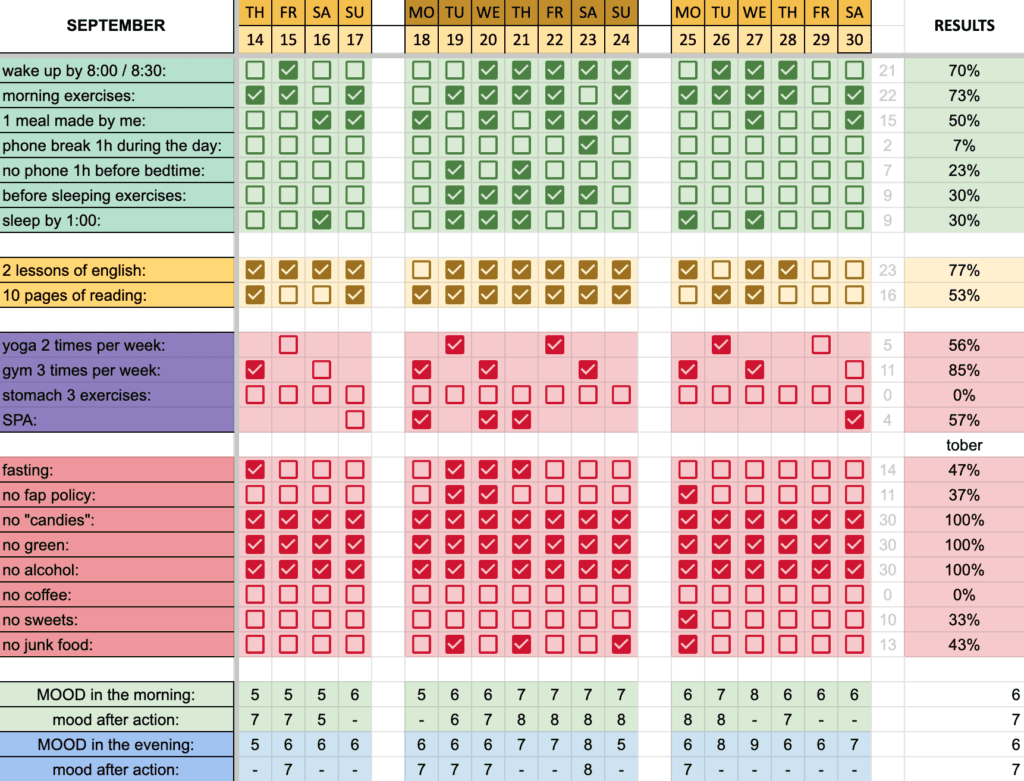 Pisałem o tym wcześniej, że codziennie rano i wieczorem oceniam swój nastrój. A zaczęło się od śledzenia moich osiągnięć w obszarach, które chciałem rozwinąć. Zawsze chcę wszystko już i teraz, a to jest zawsze skazane na porażkę. Dlatego niekoniecznie „codziennie rób to”, wystarczy monitorować jak często się coś udało.