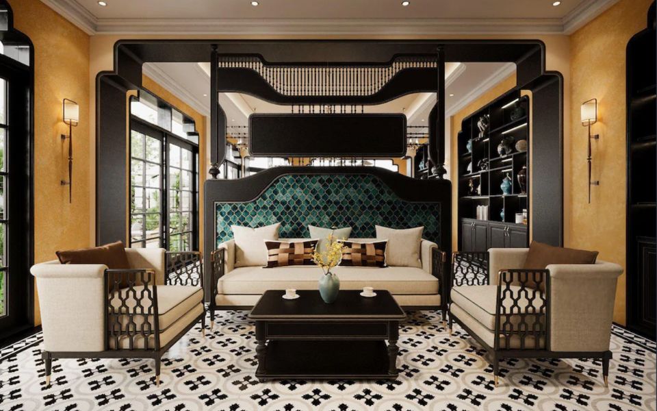 French-style villa with elegant interior decor, situated in a peaceful district, providing comfortable rooms with garden views.